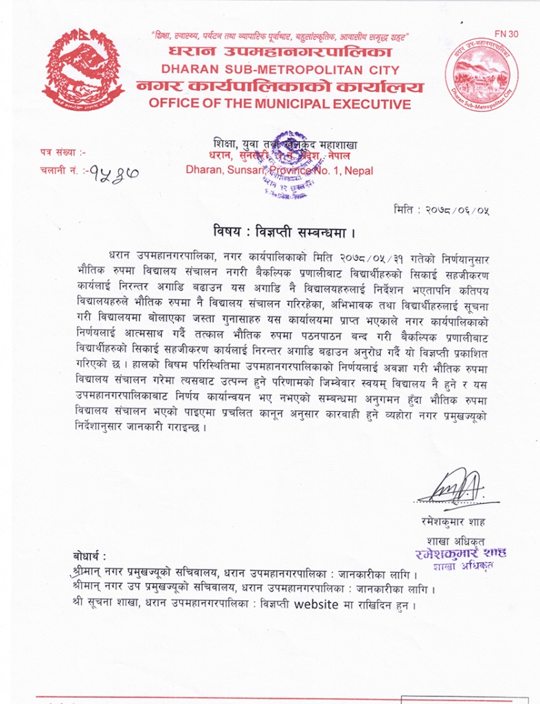 उपमहानगरपालिकाको शिक्षा, युवा तथा खेलकुद महाशाखाले धरानमा विद्यालयहरूमा विद्यार्थीको भौतिक उपस्थितिमा पठनपाठन सञ्चालन गरेको पाइएमा प्रचलित कानुन अनुसार कारबाही गरिने आज नै जारी गरेको विज्ञप्तिमा उल्लेख छ । उपमहानगरपालिकाले भौतिक रूपमा विद्यालय सञ्चालन नगरी वैकल्पिक प्रणालीबाट विद्यार्थी सिकाई सहजीकरण कार्यलाई निरन्तर अगाडी बढाउन निर्देशन दिएका थिए । धरानका कतिपय विद्यालयहरूले भौतिक रूपमा नै विद्यालय सञ्चालन गरिरहेका, अभिभावक तथा विद्यार्थीहरूलाई सूचना गरी विद्यालयमा बोलाउने गरेको गुनासाहरू नगरपालिकामा आएका कारण तत्काल भौतिक रूपमा पठनपाठन बन्द गरी वैकल्पिक प्रणालीबाट विद्यार्थीहरूको सिकाई सहरीकरणलाई निरन्तर अगाडी बढाउन विज्ञप्तिमार्फत निर्देशन दिइएको छ ।